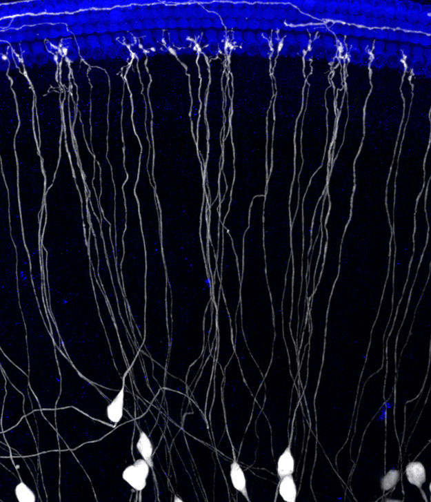 The long-term goal of the research in our laboratory is to define signaling mechanisms underlying neural circuitry formation within sensory systems and how those connections can be maintained or reestablished in cases of damage. The auditory system provides an excellent model for discovering how neural connections form within a complex organ system, as the cochlea is composed of an array of cell types and structures precisely arranged to detect a range of sound frequencies. The mammalian cochlea is composed of a beautiful and fascinating set of sensory structures including hair cells (HCs) and spiral ganglion neurons (SGNs), which are connected by glutamatergic ribbon synapses. Together, these structures transduce all auditory input into the CNS.
